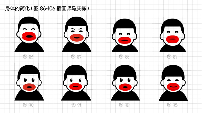 4) Can we simplify our thinking and make it more concise? Can we simplify, blur, or even delete all elements that can recognize a face? Try retaining only the eyes, eyebrows, and mouth to recognize. However, removing the expression technique of the outer contour will make the overall shape appear scattered.