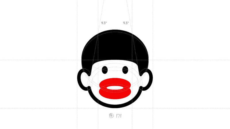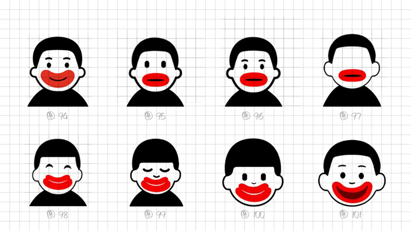 3) Geometric refinement: The eyes, eyebrows, and nose are reduced to a single cup, and when used as monochrome, many details will be blurred, resulting in a greatly reduced final presentation effect. Further simplify the individual elements in the symbols, refine the facial features, remove eyebrows, nose, hairstyle details, and summarize the face into a standard circle. At the same time, it was found that this handling technique gives people a sense of distance, lacks grounding, and lacks a bit of familiarity. Refining and simplifying also require mastering a balance.